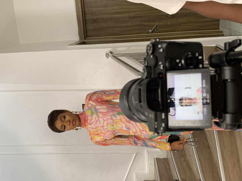 The scene depicts an indoor setting, indicative of a modern interior space, consistent with residential or commercial properties found in Lekki, Nigeria. A photoshoot or video recording is actively underway. In the middle ground, a woman stands on what appears to be a landing or lower steps of a staircase. She has short, dark, closely-cropped hair and wears long, light-colored dangling earrings. Her attire consists of a long-sleeved, high-necked dress featuring a vibrant, abstract, multi-colored pattern predominantly in pink, yellow, blue, and green. A gold-toned bracelet adorns her right wrist. Her right hand holds a black object, resembling a small clutch or phone, and a pair of eyeglasses. She gazes directly forward, towards the camera. In the foreground, a black digital camera, equipped with a large lens, is mounted on a tripod. The camera's rear display screen is visible, presenting a live preview or captured image of the woman, complete with grid lines and focus indicators. To the far right, a partial view of an individual's arm and shoulder, wearing a white short-sleeved top, is discernible, likely the person operating the camera. The background features white painted walls. To the left of the woman, a light-colored staircase with wooden or tiled treads, white risers, and a decorative white molding along the wall is visible. A metallic handrail runs parallel to the staircase. On the far right, behind the camera operator, a light brown wooden door with a silver-colored handle is present. The visible flooring is light-colored and tiled. The specific address within Lekki, Nigeria, cannot be determined from the provided visual information.
