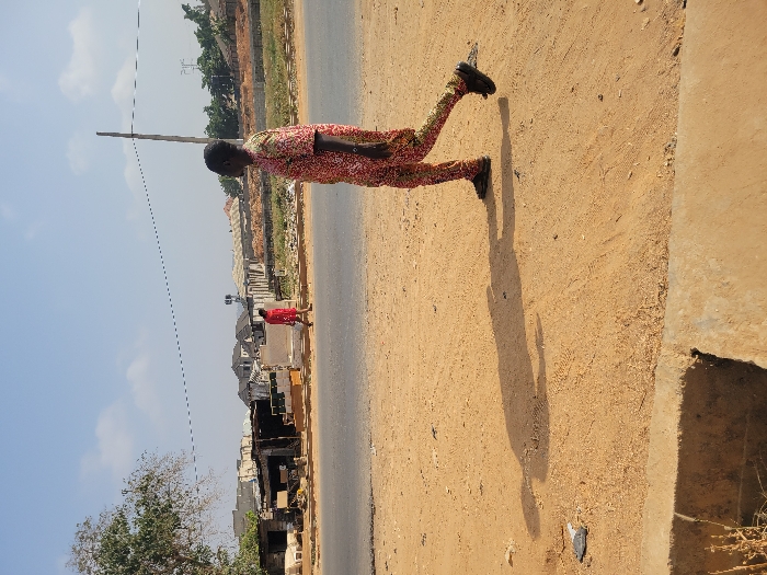 The image depicts an outdoor daytime street scene in Suleja, Nigeria. In the mid-ground, a dark-skinned individual, wearing a long-sleeved top and trousers patterned in red, yellow, and black, walks left across a dry, light brown dirt path. This individual is in mid-stride with their left leg forward, and a distinct shadow extends behind them to the left. A concrete drainage channel is visible at the bottom edge of the frame. Separating the foreground from the background is a two-lane asphalt road. On the opposite side of this road, a second, more distant dark-skinned individual, clad in solid red long-sleeved attire, walks in the same leftward direction. The background features multiple rudimentary structures constructed from corrugated metal and wood, appearing to be roadside stalls or small shops, with various objects and materials stacked outside them. Further back, piles of bricks are visible, indicating a construction or material storage area. A slender utility pole stands to the right of the background pedestrian. A tree with sparse foliage is visible on the far left. The sky is clear blue with a few scattered white clouds, indicating bright daylight conditions.