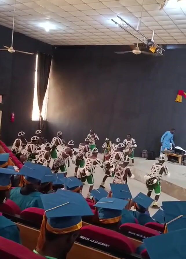 group of people in traditional costumes performing a dance on a stage in front of an audience. The dancers are wearing masks, patterned tops, and green skirts. The audience is mostly made up of people wearing graduation caps and gowns, seated in rows of red chairs. Some audience members are taking pictures or videos of the performance with their phones. The room has a high ceiling with ceiling fans and lights. There is a large black wall behind the stage, with a window on the left side. A man in a blue shirt is standing near a table on the stage, appearing to be setting up or adjusting equipment. A banner labeled "Needs Assessment" is visible on some of the chairs in the audience.