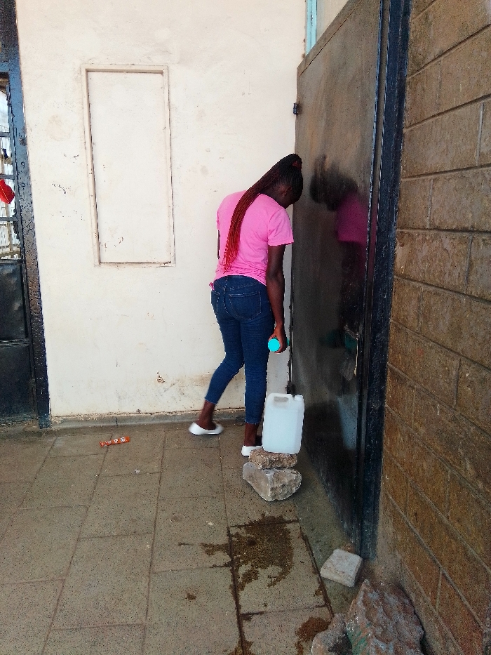 The image displays an outdoor or semi-enclosed area within Nairobi, Kenya, characterized by an individual and several objects. A person, appearing female, with dark skin and long reddish-brown braided hair styled in a high ponytail, stands with her back largely to the viewer. She is dressed in a pink short-sleeved t-shirt, dark blue skinny jeans, and white flat shoes. Her head is bowed and appears to rest against a dark, reflective metal door surface on the right side of the frame. A reflection of her upper body, including the pink shirt and hair, is visible on the door. In her right hand, extended downwards, she holds a light blue cylindrical object. On the light grey paved ground directly below her, a translucent white plastic jerry can, with a handle, is positioned on two stacked, irregularly shaped grey stones or bricks. An irregular, dark wet stain marks the pavement beneath the jerry can. Further to the left on the ground, an orange wrapper with white markings is visible. The immediate environment consists of a light-colored, possibly plastered, wall on the left, featuring a rectangular, raised or recessed panel. To the far right, a wall constructed from light brown, textured concrete blocks is present. A dark, metal-framed structure, potentially a gate or another door, is partially visible on the far left. Natural light illuminates the scene.