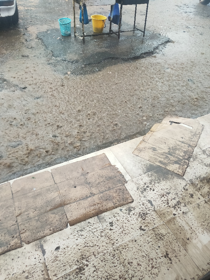 The image depicts an outdoor scene in Oloolua ward, Kenya, during a rainfall event. The ground is heavily saturated with water, showing numerous ripples and splashes from active rain. The scene is divided into two primary ground levels: a lower, darker, uneven street or pathway covered in muddy water, and an elevated, lighter-colored paved area, likely a sidewalk or platform. The lower ground features a dark patch of what appears to be worn asphalt or dirt, completely submerged in shallow, brown rainwater. In the upper-middle left, positioned within a large puddle, stands a dark-colored, four-legged metal framework or table. Hanging from its upper structure are two blue fabric items, possibly bags or cloths. At the base of this framework, a light blue plastic mesh basket and a yellow plastic bucket are visible, also partially submerged in water. A portion of a dark vehicle, possibly a tire and fender, is visible in the extreme upper-left corner of the frame. The elevated paved area, composed of light-colored, possibly concrete or tiled surfaces, shows distinct water and mud splatter patterns, particularly on the tiles closer to the waterlogged lower ground. On this paved surface, two large, flattened, rectangular sheets of what appear to be wet, soiled cardboard are laid out. An additional smaller piece of cardboard is partially visible in the bottom-left corner. No individuals are present in the image.