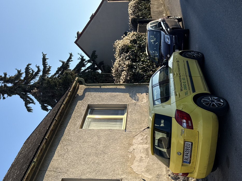 The image depicts a static street scene in Hainburg an der Donau, Austria. In the foreground, a bright yellow Skoda Fabia hatchback is parked parallel to the curb, facing away from the camera. Its rear license plate, "BL 428 EU," identifies it as registered in Bratislava, Slovakia. The passenger side displays German text, including "PROO REALT... BAUAR... UND REKONSTRUKTION VON HÄUSERN...", "WOHNUNGENUND GEBÄUDEN...", a telephone number "0660 81 65...", and an email address "HAUSERNREKONSTRUKTION@GMAIL". Behind the yellow vehicle, a dark-colored (likely black or dark blue) Fiat Panda compact car is also parked parallel to the curb, facing towards the camera. To the immediate left of the vehicles stands a two-story residential building with a light grey, textured stucco facade exhibiting weathered cracks and discoloration. It has a dark, pitched roof with visible moss or grime, a greenish metal gutter, and a downspout. One window with a light-colored frame and sheer curtains is visible. A large, dark green evergreen conifer tree rises prominently in the mid-ground, positioned between the primary building and a second, partially visible building in the background. The background building has a light-colored facade and a reddish-brown pitched roof with a chimney. A dense line of bushes, featuring dark green foliage (possibly ivy) intertwined with lighter, clustered plant material, runs along a fence line between the parked cars and the background building. The street is paved with asphalt, and a concrete curb is present. The sky above is clear and bright blue. Strong, low-angle sunlight illuminates the scene, casting distinct shadows to the left of the buildings and vehicles, suggesting either early morning or late afternoon. No individuals or active interactions are present in the frame.