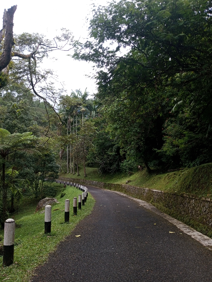 A curving asphalt road cuts through a lush, green landscape. A low stone wall runs along the right side, with grass growing on top. The road is bordered on the left by short, painted posts. Dense trees and foliage fill the background, suggesting a forest or botanical garden. The sky is overcast, creating soft, diffused light. The overall impression is a peaceful, natural setting.