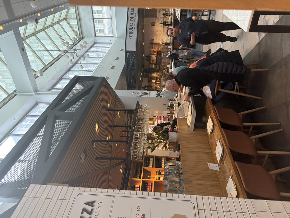 restaurant interior. Several patrons are seated at a long bar, with wine glasses and bottles displayed behind it. A sign reads "CRUDO DI MAR". A structure with wooden slats and metal beams is visible above the bar, and a skylight is above that. A sign that says "PIZZA" is in the lower left corner. The chairs are brown and simple in design.