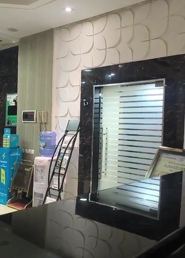 The camera pans across a lobby-like space. There is a black glossy surface in the foreground, possibly a countertop. Behind it, the space contains two elevators with horizontal striped glass. Next to the elevators are water coolers, boxes of what appear to be drink products, and a rack holding informational leaflets. The walls are decorated with textured patterns and wallpaper. The ceiling is white with inset lighting panels. There are no people visible in the shot.