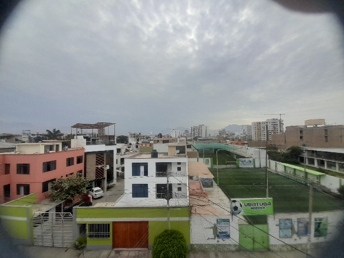 An elevated, wide-angle view captures a dense urban landscape in Trujillo, Peru, specifically focusing on the vicinity of the Ubatuba Soccer complex in La Esperanza. The sky is overcast with a uniform layer of grey clouds, indicating diffuse lighting. In the immediate foreground, a series of multi-story residential or commercial buildings are visible. To the left, a three-story building is painted in a salmon-pink hue. Adjacent to it, a white building with dark window frames and a textured facade leads to a driveway where a white sedan is parked. Further right, another white multi-story building features prominent blue window accents. The lower sections of buildings in the foreground, including perimeter walls, are painted in shades of lime green and white, often featuring metal gates. Overhead, utility lines crisscross the scene. The midground is dominated by a large, fenced artificial turf soccer field, clearly identified by a prominent white and green sign displaying "UBATUBA SOCCER" and a soccer ball logo. Additional smaller signs are affixed to the perimeter walls of the field. Surrounding the field are various buildings of differing heights and architectural styles, some appearing to be part of the soccer complex, while others are residential or commercial. A covered rooftop terrace structure is visible atop a white building further back on the left. In the background, the city extends into a denser collection of multi-story buildings and high-rises, with some structures appearing to be under construction, indicated by a visible crane. Distant mountains or hills are faintly discernible on the horizon, partially obscured by atmospheric haze. No individuals or specific actions are discernible within the frame.