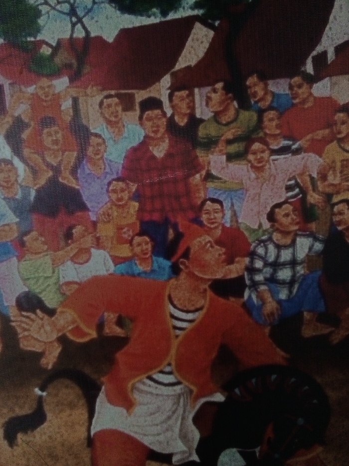The image displays a painting depicting a crowded outdoor scene in Voa Yeav, Cambodia