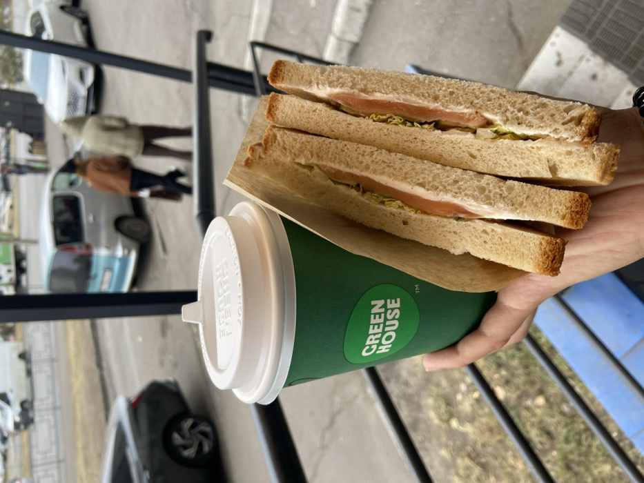 A hand holds a green disposable coffee cup and a salmon and lettuce club sandwich, wrapped in brown paper, from "GREEN HOUSE" coffee shop