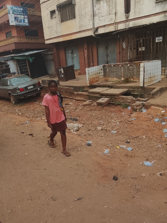 A young person walks along a dusty street in a neglected urban environment