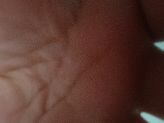 The image displays an extremely blurred and out-of-focus close-up, primarily composed of reddish-brown and beige tones. The dominant subject presents organic textures and contours consistent with human skin, potentially a hand or fingers, occupying the central and lower portions of the frame. Minor surface variations resembling skin creases are observable. In the upper region, two indistinct, light blue shapes are present, appearing as out-of-focus light sources or reflections. No identifiable individuals, distinct objects beyond the primary subject material, or specific actions are depicted. The ambient environment is completely obscured by blur. The visual data within the image is insufficient to identify any specific location in the city of Levice, Slovakia.