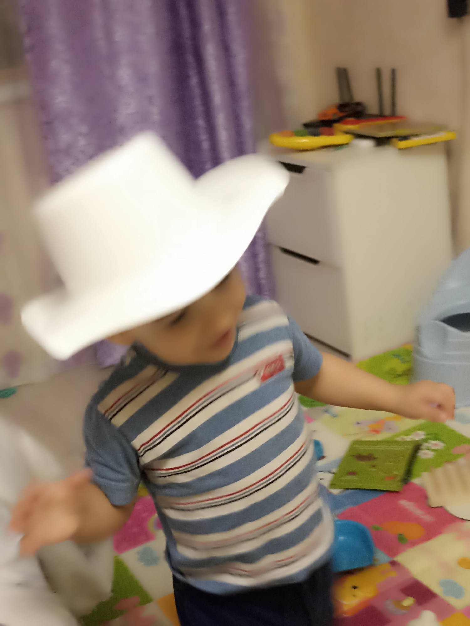 The image depicts a young child, approximately 1-3 years old, located indoors within a residential setting in Serpukhov, Russia. The child is wearing a white wide-brimmed hat, a short-sleeved t-shirt with horizontal blue, white, red, and black stripes, and dark-colored pants. The child is in motion, indicated by motion blur, with arms slightly extended from the body as if walking or balancing. The child's gaze is directed downward and to the right within the frame. The immediate ground surface consists of a multicolored foam playmat, featuring interconnected tiles in shades of pink, green, yellow, and blue, adorned with simplified graphic patterns. A small blue plastic object, possibly a toy cup, and a green rectangular item, possibly a book or card, are visible on the playmat near the child's lower right. In the background, a white cabinet or dresser with multiple compartments is situated to the right. Various small, colorful objects, including a yellow toy with discernible buttons, are placed on top of this cabinet. A light purple curtain with a faint pattern hangs in the background to the left, partially obscuring a light-colored wall.