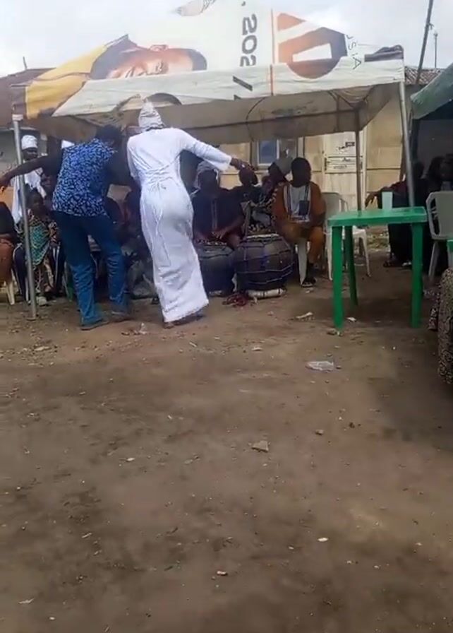 A group of people gathered under a tent engage in a rhythmic drumming and dance performance. Dressed in a long, flowing white robe, one person dances barefoot on the dirt ground, guided by another person wearing a blue patterned shirt and jeans. The dancers move facing a group of seated musicians playing various percussion instruments. Several onlookers are seated in the background. A green plastic table sits unoccupied near the edge of the tent. The setting appears to be an outdoor gathering on a dirt surface with buildings visible in the background. The sky is overcast.