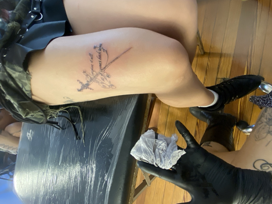 A person sits with a tattoo of two swords and text reading "forgive it all as it comes back to me" on their thigh. They wear black shoes and a black garment. A hand in a black glove holds a white tissue. The scene appears to be in a tattoo studio with a table covered in plastic wrap and a wooden floor. Another tattooed leg is also visible.