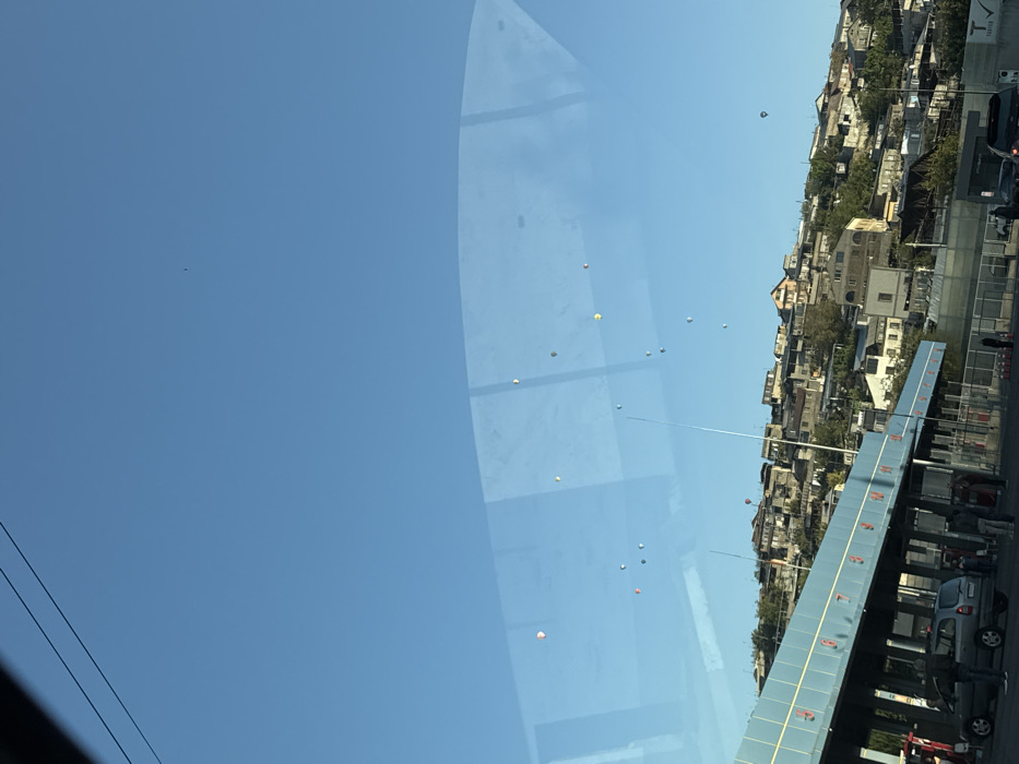 The image depicts an outdoor, daytime scene within the city of Yerevan, Armenia, characterized by a clear blue sky, a dense urban hillside, and a ground-level public facility. The upper two-thirds of the image features a bright, unobstructed blue sky. Numerous small, brightly colored spherical objects (balloons) are scattered across the sky, appearing in shades of red, white, yellow, orange, and light blue. One larger, darker hot air balloon is visible on the far right horizon. Reflections of window frames or structural elements are visible on the upper portion of the image, suggesting the photograph was taken through glass. Two dark power lines run horizontally across the top left corner. The mid-ground reveals a densely populated urban area built into a steep hillside. This landscape is covered with numerous multi-story residential or commercial buildings constructed primarily from concrete or stucco, displaying muted colors such as grey, brown, and off-white. Sparse green vegetation, consisting of trees and shrubs, is interspersed among the structures. The foreground presents a multi-bay ground-level structure, likely a toll plaza or similar access point, with a blue canopy and support pillars. Each bay is numbered with red numerals on white panels, from "1" on the left extending to at least "10" on the right. Below the numbered panels, red circular elements are visible. Several individuals are present on the paved ground near this structure, standing or moving. A light grey hatchback vehicle is parked or idling near the left side of the structure, with a person standing by its driver's side door. Further right, a dark-colored SUV or sedan is visible. A white sign with a green checkmark and the word "TERRA" is discernible on the right side. Tall, slender poles or antennas extend upwards from the mid-ground. A mesh or metal barrier separates the immediate foreground from the hillside.