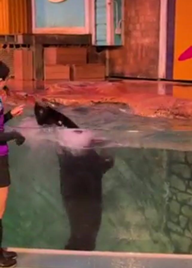 The scene features a seal in an aquarium, with an individual standing nearby. The seal is dark in color, and appears to be actively swimming, creating splashes in the water. The aquarium is a transparent structure, allowing for a clear view of the seal's underwater movements. The individual next to the tank has short dark hair, and is wearing a black long-sleeved shirt, a purple vest, black shorts, and black shoes. They are making hand gestures, which may be related to training or directing the seal. The background features a colorful, thematic set design that could be part of an animal show or exhibit. The area is well-lit, highlighting the activity in the aquarium and the surrounding environment.