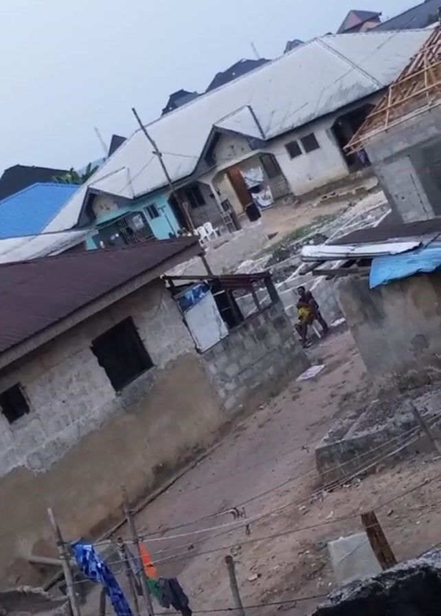 n exterior daytime shot of a neighborhood in what appears to be a developing country. The camera is positioned at an elevated angle, possibly from a building. Several buildings are visible, constructed primarily from cement blocks, with corrugated metal roofing. The roofs are a mix of colors including brown, grey, and blue. A person in dark clothing, accompanied by a child in a yellow and blue outfit, walks along a dirt path between the buildings. Clothes are drying on a clothesline strung between wooden poles in the foreground. There is scattered debris in the vicinity. The sky is overcast. The camera movement is shaky. Music is audible in the background.
