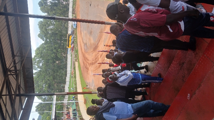 The image depicts a scene at Gusii Stadium in Kisii, Kenya, viewed from beneath a covered spectator stand