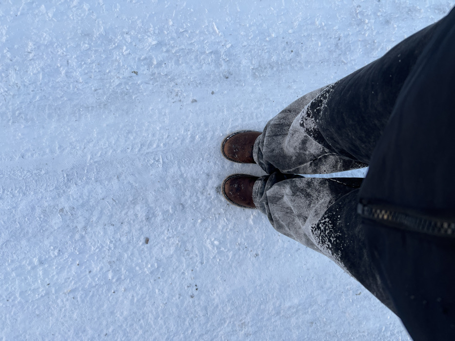 The image depicts a downward-facing perspective of a person standing on snow-covered ground in the city of Невон, Russia. The subject's lower legs and feet are visible. The person is wearing dark-colored trousers, appearing black or very dark grey, with a noticeable accumulation of white snow and ice adhering to the lower and mid-sections of both legs. Their feet are clad in brown, possibly leather, boots with visible stitching and textured soles, resting directly on the icy snow. The ground consists of a textured, light blue-white layer of packed snow or ice, showing subtle variations in surface texture and minor dark discolorations, potentially from dirt or debris. A section of a dark, likely black, zipped jacket or coat is visible in the immediate foreground, partially obscuring the upper body.