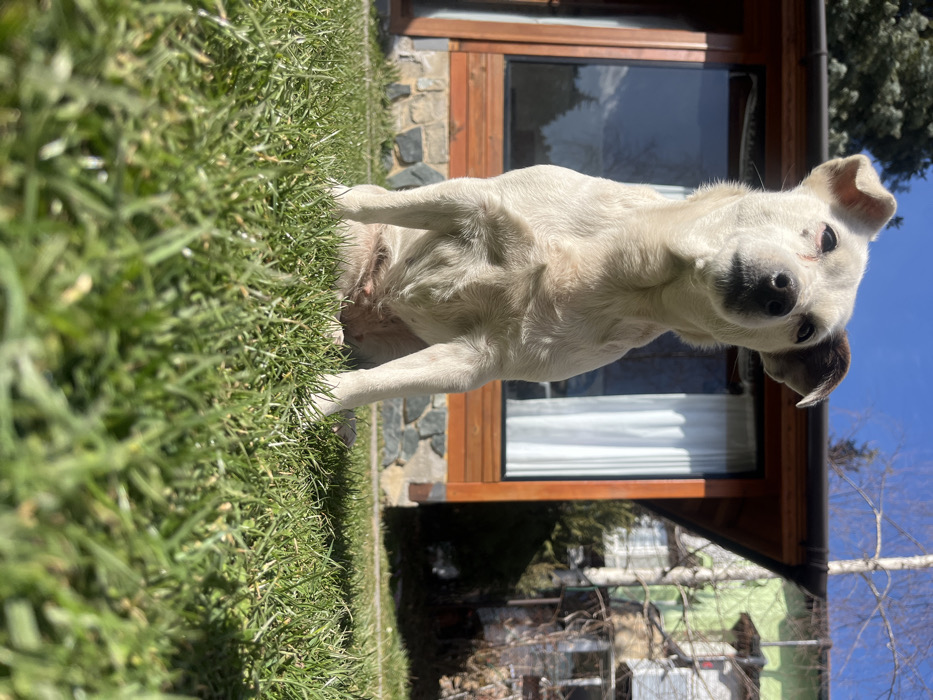 A white-furred dog, with a distinctive brown patch on its right ear, is positioned in a seated posture on lush green grass. The dog faces forward and slightly upwards, its dark eyes directed towards the observer. A faint reddish discoloration is visible below its left eye. The immediate background features a low-rise building constructed with a wooden facade, large reflective windows, and a lower section of grey stone. White curtains are visible through the windows. The broader background reveals a clear blue sky, assorted trees (some bare deciduous, others evergreen), and a partial view of a light green residential building with a dark roof. The scene is illuminated by direct sunlight, indicating an outdoor setting during daytime in Vladaya, Bulgaria.