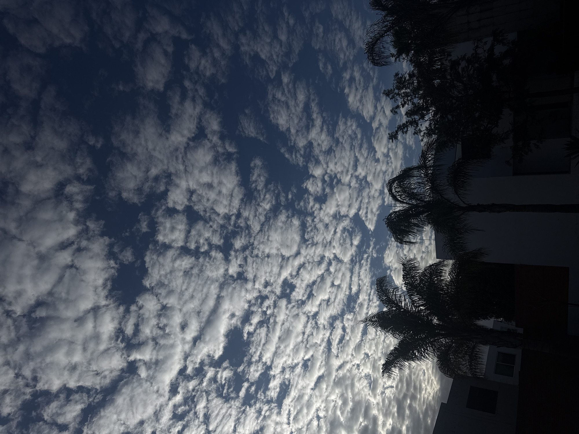 sky filled with altocumulus clouds over what appears to be part of the city of San Pedro Cholula, Mexico, given the architectural style and the presence of palm trees. The view is oriented upward. Buildings are visible at the right edge of the frame, in silhouette, as are the silhouettes of palm trees and other foliage. The light indicates it is either early morning or late afternoon. The sky is a deep blue, visible between the clouds.