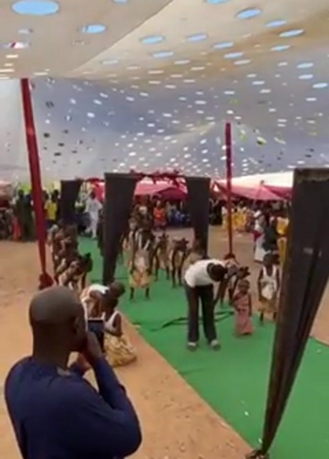 The scene shows a group of children performing a coordinated dance or bow in unison in a brightly lit outdoor event. They are dressed in similar, patterned clothing and are performing on a green carpet laid out in a straight line. An adult, possibly a choreographer or instructor, is positioned among them, guiding their movements. They are performing under a large, decorative tent-like structure with numerous circular cutouts, allowing natural light to filter through. The event appears to be well-attended, with spectators seated on either side of the carpeted area. A man dressed in blue is recording the performance with a mobile phone. The overall setting seems to be a celebration or a cultural event in an open space.