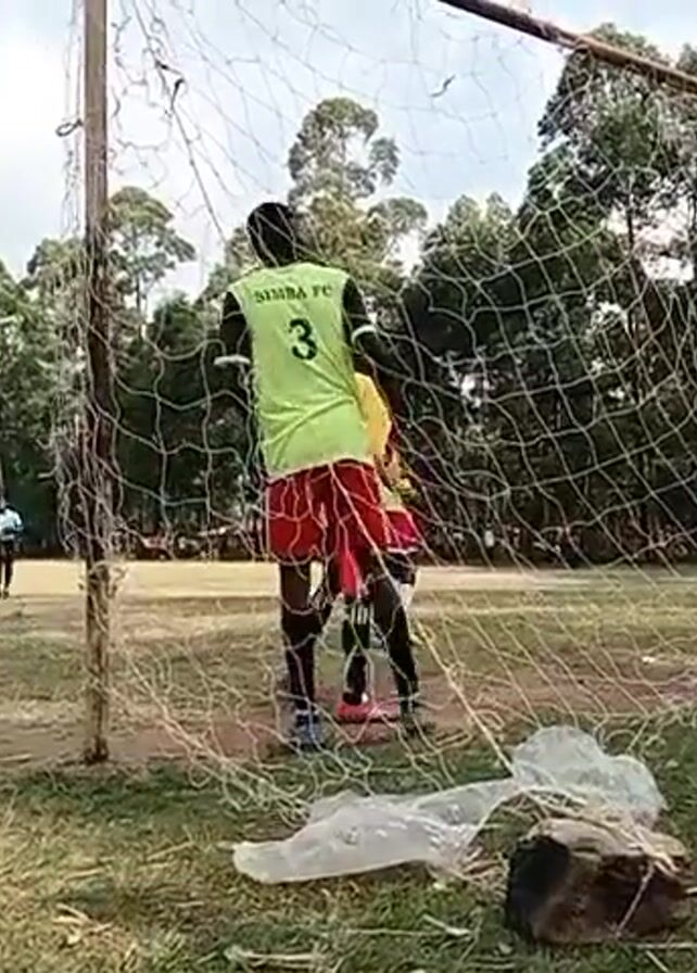 soccer game on a grassy field. The camera is positioned behind one of the goals, looking out onto the field of play through the net. Several players, some wearing green and others in white and black uniforms, are visible on the field. The goalkeeper, wearing a light green jersey with the number 3 and red shorts, stands in front of the net, ready to defend. Other players are in motion, seemingly engaged in a play towards the goal. The field is surrounded by trees. A plastic bag and a rock are present on the ground in front of the goal. The sky is overcast, suggesting it is either early morning or late afternoon.