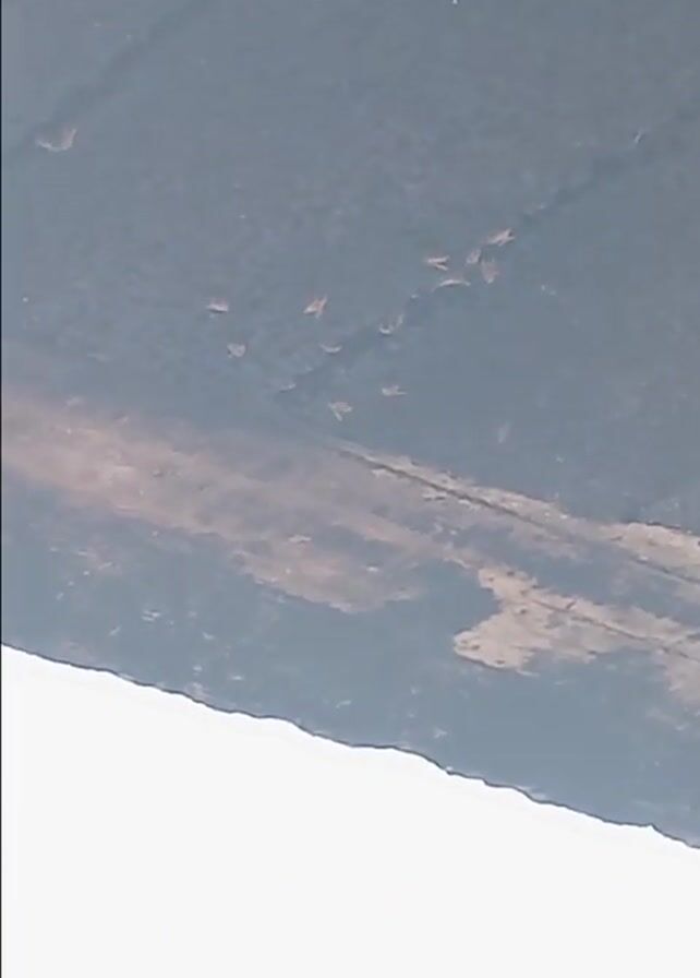A camera is looking up at the edge of a dark, rough surface, possibly a building overhang. There are several small, reddish-brown spots clinging to the surface. A crackling sound is audible. The camera angle shifts slightly during the clip.