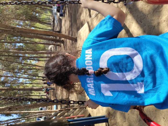 A child is depicted from behind, seated on a red swing within an outdoor recreational area in Modi'in-Maccabim-Re'ut, Israel. The child wears a bright blue short-sleeved jersey displaying "MARADONA" in white capital letters across the upper back, above a large white numeral "10." Dark, curly hair is styled into a single braid secured with a light-colored band. Both hands grasp the dark metal chains supporting the swing's red seat. The child faces forward, looking towards a background dominated by numerous tall, slender trees with light brown trunks and green foliage, consistent with a pine or similar coniferous forest. The ground is composed of dry, light brown soil. In the mid-distance, blurred figures of other individuals are visible among the trees. A light-colored vehicle is partially visible behind a wooden fence on the left side of the background. The scene is illuminated by bright daylight, casting some shadows.