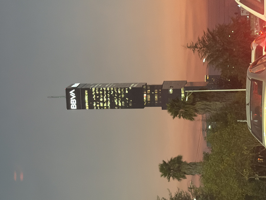 A tall, dark BBVA-branded skyscraper with many illuminated windows dominates the frame, set against a twilight sky with a soft orange and gray gradient. Palm trees are visible in the foreground. The view is partially obstructed by cars and foliage to the right side of the frame.