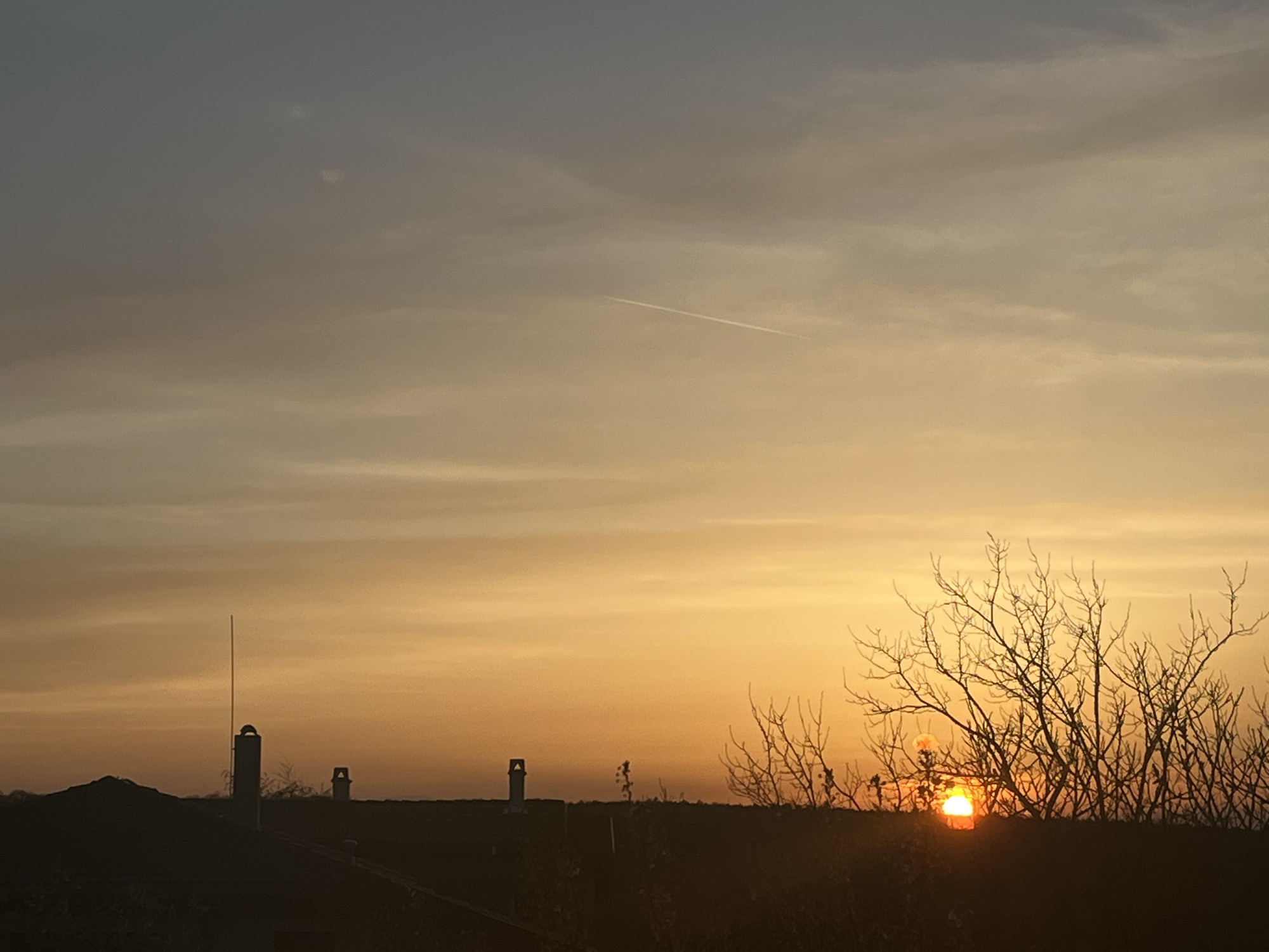 The image depicts a sunset scene. In the foreground, there are silhouetted trees and shrubs, with the sun partially obscured behind them, creating a bright spot. Above the trees is a rooftop with several chimneys or structures. The sky is gradated from a darker blue-gray at the top to a golden-yellow near the horizon. A contrail is visible across the sky. The location appears to be the edge of a city or suburban area given the presence of both natural elements and built structures. The city and country are not identifiable based on the image.