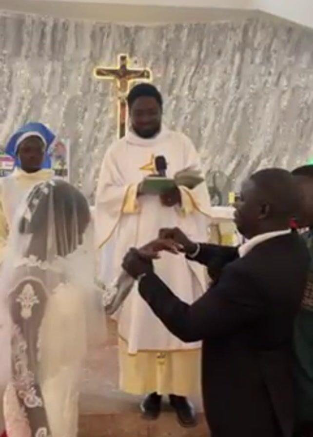 wedding ceremony inside a church. A bride in a white gown with a veil stands to the left, and a groom in a black suit stands to the right. A priest in a white robe with a cross is in the center, holding a book and a microphone. Another man, possibly an officiant, is speaking into a microphone. Several other people are in the background, including a woman in a red dress and a green headwrap, and a man in a green and gold outfit. The church interior has a marble wall, a golden cross above the altar, and overhead lighting. The sound suggests celebratory music is playing.