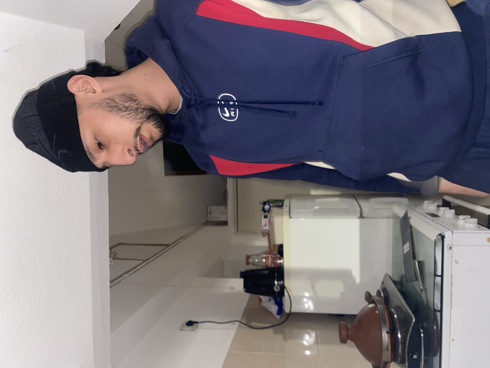 - "A man wearing a black beanie, a blue hoodie with a white and red stripe across the chest, is standing in a kitchen" by FM-WEULP2, licensed under CC BY 4.0