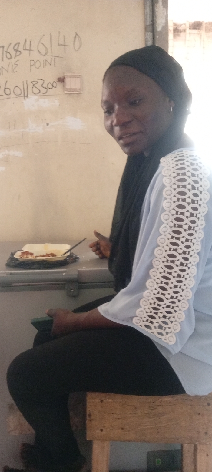 An adult female is depicted seated indoors at an undisclosed location within Aviation Quarters, Nigeria