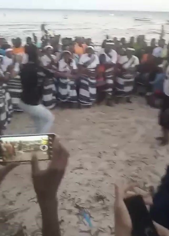 crowd of people on a beach, observing and recording a dance performance. The dancers are in the center, with one man in a tank top, shorts, and a headdress, and a woman in jeans and a black shirt. A group of people, some wearing matching striped outfits, are standing in a semi-circle behind the dancers, clapping and singing. The beach is crowded, and in the background, the ocean can be seen with boats and people. Many in the crowd are recording the performance with their phones.