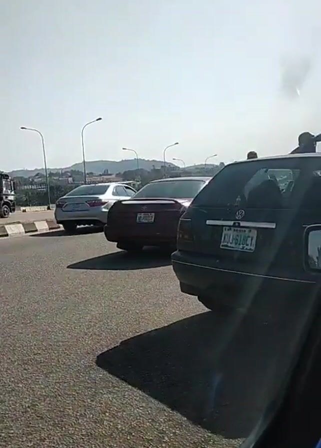 traffic jam on a highway, with several cars visible in the frame. The camera appears to be inside a car, looking out the passenger window. The car in front is a dark-colored Volkswagen with a Nigerian license plate. There is a maroon-colored sedan ahead of the Volkswagen, and a silver sedan to the left. The road is paved and there are street lights lining the highway. In the distance, there is a hill or mountain visible. The sky is bright and clear. At the beginning of the video, a person is briefly visible standing in the sunroof of a car ahead. The traffic is slow moving, and the cars are close together.