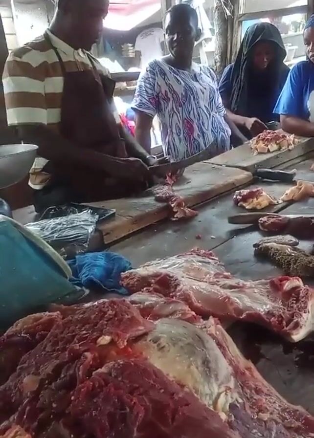meat market with several people around a wooden table covered in raw meat. A man in a striped shirt and brown apron is cutting the meat with a large knife. Three women stand nearby, seemingly observing or preparing smaller portions of meat. There are other pieces of meat and knives scattered on the table. In the background, there are windows or openings that suggest the market is an open-air structure. There's also a blue scale and other items partially visible on the table. The atmosphere appears busy, with people focused on their tasks of butchering and preparing the meat.