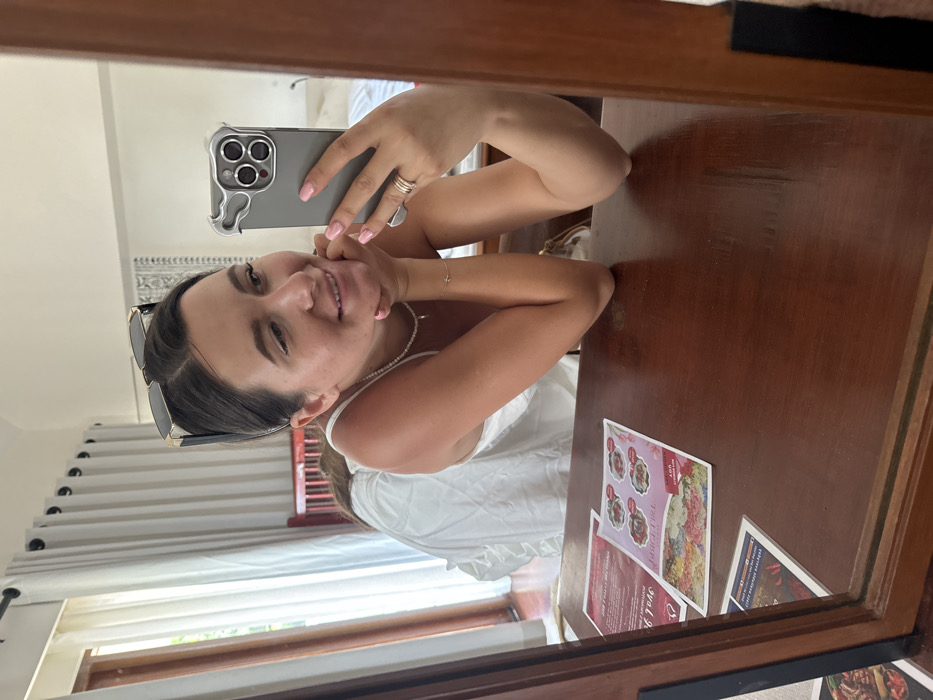 A woman with dark hair and sunglasses resting on her head is taking a selfie in a mirror. She's wearing a white top and a delicate necklace. Her phone, with a gray case and visible camera lenses, is held up in her right hand. The mirror reflects a room with white curtains. A dark wooden table is in front of her, with several cards or pamphlets scattered on its surface. The mirror is framed with dark wood.