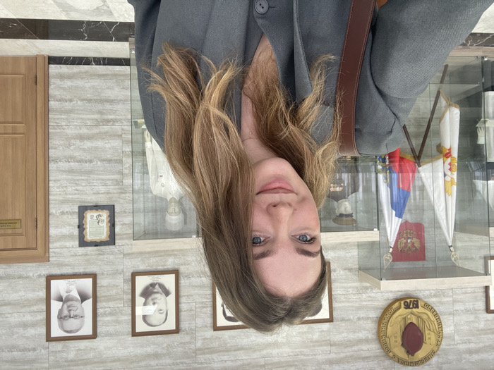A young adult female is depicted in a selfie, smiling directly at the camera. She has light brown hair, blue eyes, and is wearing a grey blazer with a brown bag strap visible over her right shoulder. The background reveals an interior hallway of a medical research institution. On the wall directly behind the subject, a large circular wooden plaque is prominently displayed. It features a red heart-shaped emblem in the center and is inscribed with the Cyrillic text "НИИ ТРАНСПЛАНТОЛОГИИ И ИСКУССТВЕННЫХ ОРГАНОВ" (Research Institute of Transplantology and Artificial Organs) and the year "1976." To the right of the plaque, three framed portraits of men are mounted on the wall; two older male figures are clearly visible. Below these, a series of glass display cases are present. One case contains a white flag with a gold emblem, alongside the Russian national flag (white, blue, red), partially obscuring a mannequin dressed in a military uniform. Another display case houses a mannequin wearing a white medical uniform, including a cap. Further to the right, a plain wooden door with a small, partially legible nameplate is visible. The wall behind the displays and door features a light grey, stone-patterned finish, while the floor consists of polished black and white tiles in a checkered pattern. This location is identified as the National Medical Research Center of Transplantology and Artificial Organs named after Academician V.I. Shumakov (НМИЦ ТИО им. ак. В.И. Шумакова), situated at Shchukinskaya St, 1, Moscow, Russia.