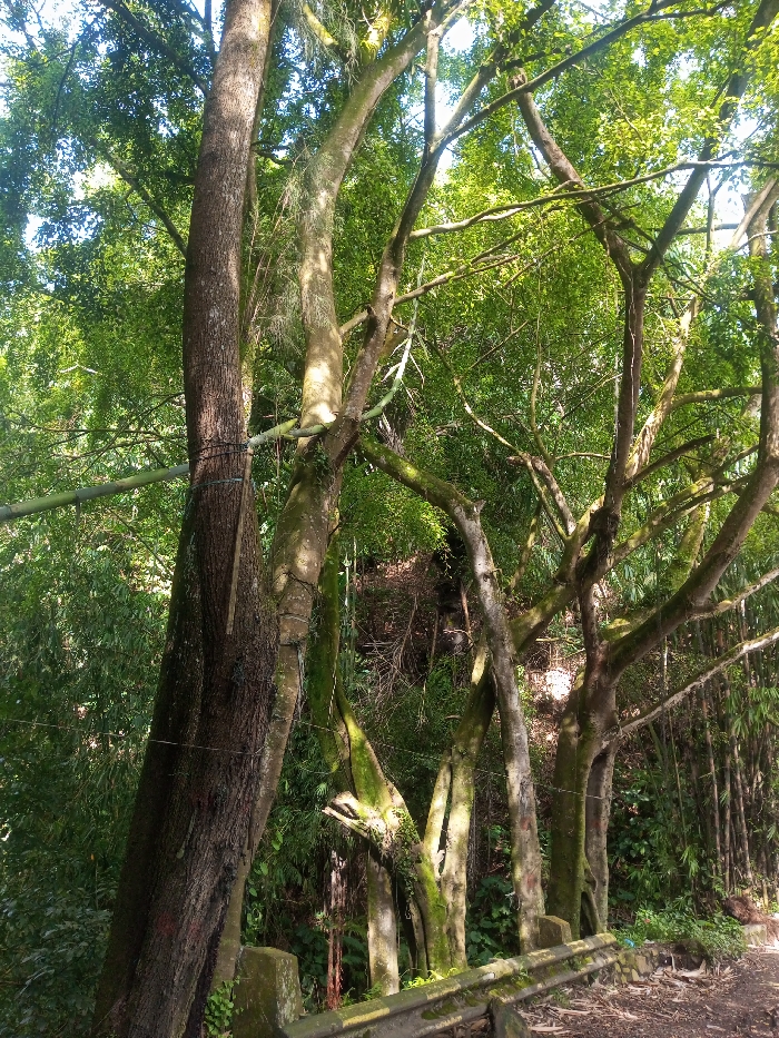 The image displays a dense forest environment in Thanthirimale, Sri Lanka, under bright, dappled sunlight. The foreground is dominated by several large trees. On the left, a tall tree with dark, textured bark features a horizontal bamboo pole secured to its trunk with dark lashing, and a thin, light-colored wooden or bamboo strip tied vertically against it. To its immediate right, another tree exhibits lighter bark and a fibrous, stringy growth. Further right, a cluster of trees with moss-covered, gnarled trunks and numerous bare branches extends upwards. A low, weathered concrete or stone barrier, partially covered in moss and green vegetation, runs horizontally across the lower third of the frame. Beyond the trees and barrier, a steep embankment densely covered with green foliage, including bamboo, recedes into the background. The ground visible near the barrier on the right is disturbed earth with sparse leaf litter. No individuals are present in the scene.