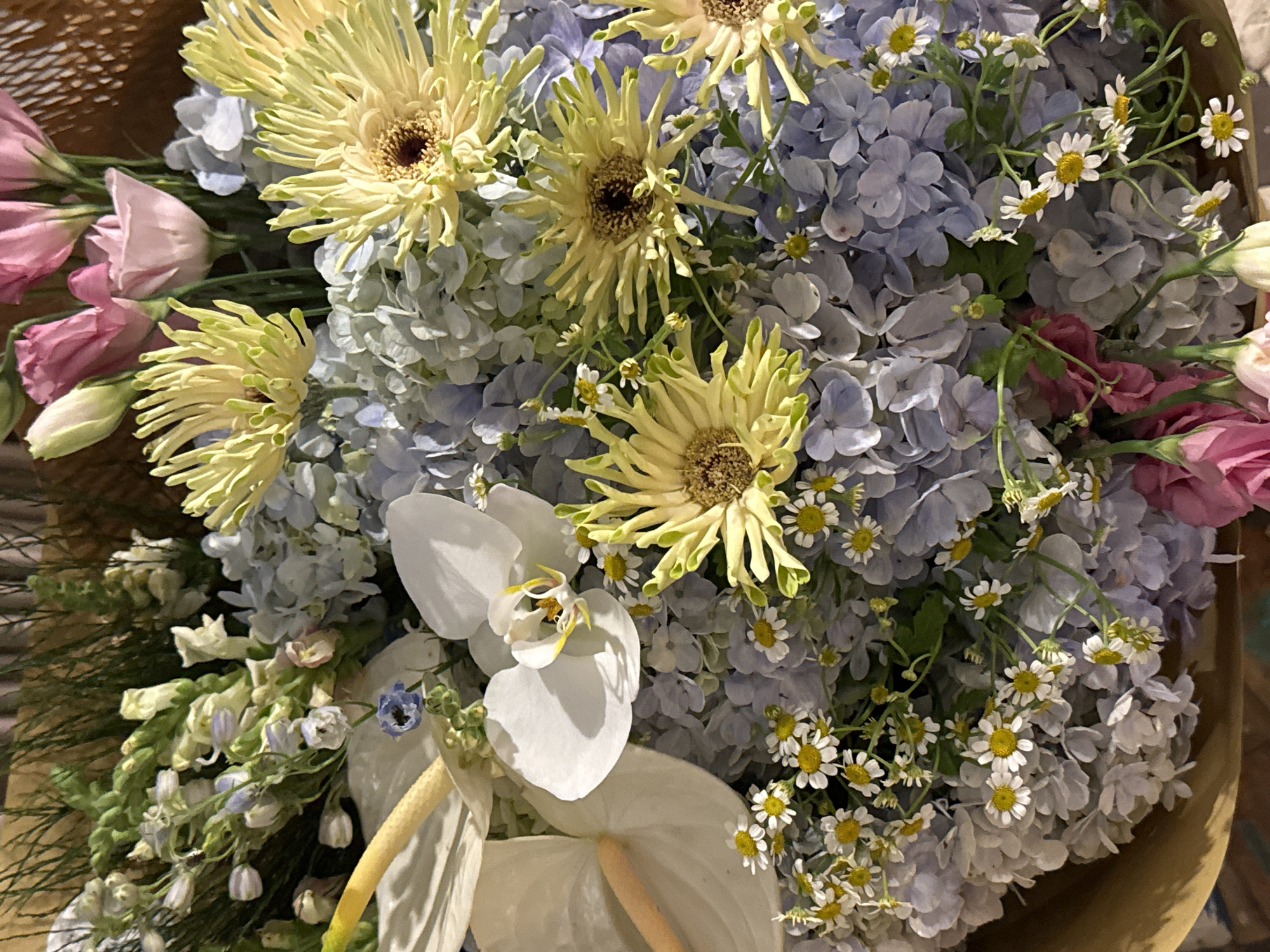 A close-up overhead shot depicts a vibrant bouquet of flowers. The arrangement includes clusters of light blue hydrangeas, daisies with white petals and yellow centers, and several yellow gerbera daisies. Also present are white orchids and pink lisianthus. The bouquet is arranged in what appears to be a brown paper wrapping or container. The image was taken in North Kuta, Indonesia.