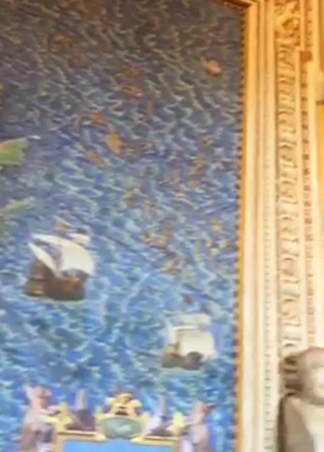 n interior space with elaborate and ornate decorations. The camera pans upwards from a large map-like image on the wall, depicting land and sea, with painted ships and figures. The camera continues to move upwards, revealing the ceiling. The ceiling is highly decorated with painted panels depicting various scenes, surrounded by ornate gold and green trim. The panels are separated by intricate, three-dimensional architectural details. The scene suggests a richly decorated historical building, possibly a palace or museum. There are no people visible.