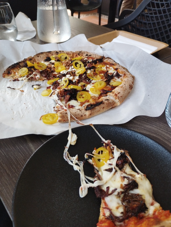 The image captures an indoor dining setting, likely a restaurant or cafe in Petah Tikva, Israel. The primary subject is a partially consumed, round pizza, approximately 12-14 inches in diameter, resting on white parchment paper over a dark wooden table. The pizza exhibits a charred crust consistent with a wood-fired or Neapolitan style, topped with melted white cheese, dark shredded meat, caramelized onions, crumbled white cheese (likely feta), and bright yellow sliced peppers. Multiple slices have been removed from the whole pizza. In the foreground, a single slice of this pizza lies on a black, matte-finish plate. Significant strands of melted white cheese are stretched vertically from this slice, indicating it is being lifted or pulled from the main pizza. On the table, to the upper left, a clear glass carafe filled with water and a clear drinking glass containing water are visible, along with a crumpled white napkin. In the upper right background, a brown cardboard container holds a white napkin. Further in the background, a dark-colored chair with a distinctive grid pattern on its backrest is visible, along with a portion of a person's light-colored clothing or arm. The overall environment suggests a casual dining establishment.