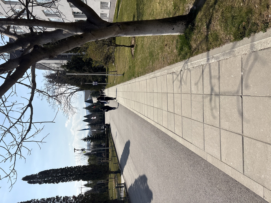 The scene depicts an outdoor campus environment at the University of National and World Economy (UNWE) in Sofia, Bulgaria, observed on a clear, sunny day. In the immediate foreground on the right, the lower trunk of a deciduous tree, painted white at its base, is visible with bare branches extending into the upper right corner, casting distinct shadows. Adjacent to this tree, a light grey paved sidewalk, composed of square tiles, stretches into the distance. A narrow strip of green grass borders the sidewalk on its right. Parallel to the sidewalk on the left is an asphalt road. Two individuals, appearing to be adults, are walking away from the camera on the sidewalk. The person ahead wears a light-colored top and dark trousers, while the person slightly behind wears dark outerwear and trousers. Their shadows are cast ahead of them. Along the left side of the asphalt road, a line of tall, slender coniferous trees stands, with a low metal fence partially visible behind them. Further in the distance on the left, a construction crane is partially visible against the sky. Multiple flagpoles displaying flags are present in the mid-ground. Streetlights are intermittently spaced along the pathway. On the right, beyond the sidewalk and grass, a large, multi-story institutional building with a light-colored facade and numerous rectangular windows extends into the background. The sky is predominantly clear blue with some scattered white clouds visible on the horizon. The scene is illuminated by natural sunlight, producing defined shadows.