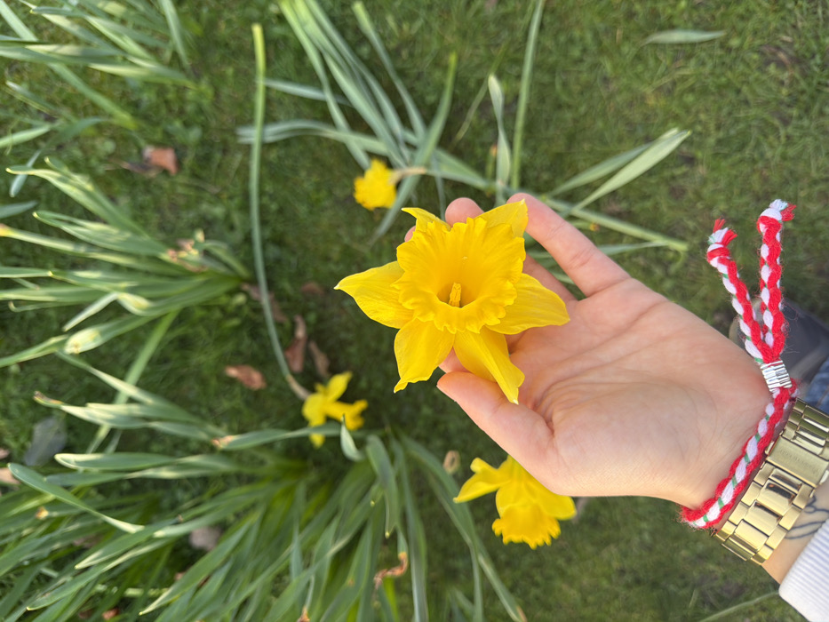 - "This image, captured in Warrington, United Kingdom, depicts a close-up, top-down view of a human hand holding a single bright yellow daffodil" by FM-1FhX33, licensed under CC BY 4.0