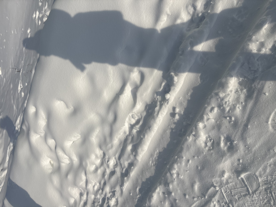 A ground view shows fresh, untouched snow with a dark shadow cast upon it, hinting at an unseen object. Tracks slice across the snowy canvas, disrupting its pristine surface. These tracks, defined by denser snow, indicate a path or repeated passage. The snow's texture ranges from smooth drifts to granular clusters, adding depth.