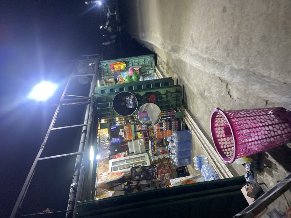 This image depicts a nighttime scene in Yenegoa, Nigeria, focused on an illuminated storefront. The store, constructed from green corrugated metal or modular panels, is open to the viewer. Inside, various consumer goods are displayed, including numerous large plastic water dispenser bottles, smaller bottled waters, stacked cases of soft drinks, packaged snacks, and other assorted merchandise visible on shelves and hanging. Bright interior lighting illuminates the products, and a strong, unshielded light source casts a prominent flare above the shop's roofline. Mounted on the exterior of the shop, two circular convex mirrors reflect portions of the immediate surroundings. The upper mirror clearly shows the reflection of two individuals, appearing to be children or small adults, one in a patterned top, the other in white, looking outward. The lower mirror reflects a partial view of the ground and what appears to be the lower body of a person or object near a pink plastic basket. In the foreground, on a concrete pathway or sidewalk, a tall, perforated pink plastic basket or hamper stands upright. Nearby, on the ground, some litter and debris are visible. The pathway extends towards the right, showing a slight elevation change. The sky is dark, indicating night, with distant lights faintly visible further down the path or road. No explicit actions or interactions are depicted, only the static setup of a small retail establishment.