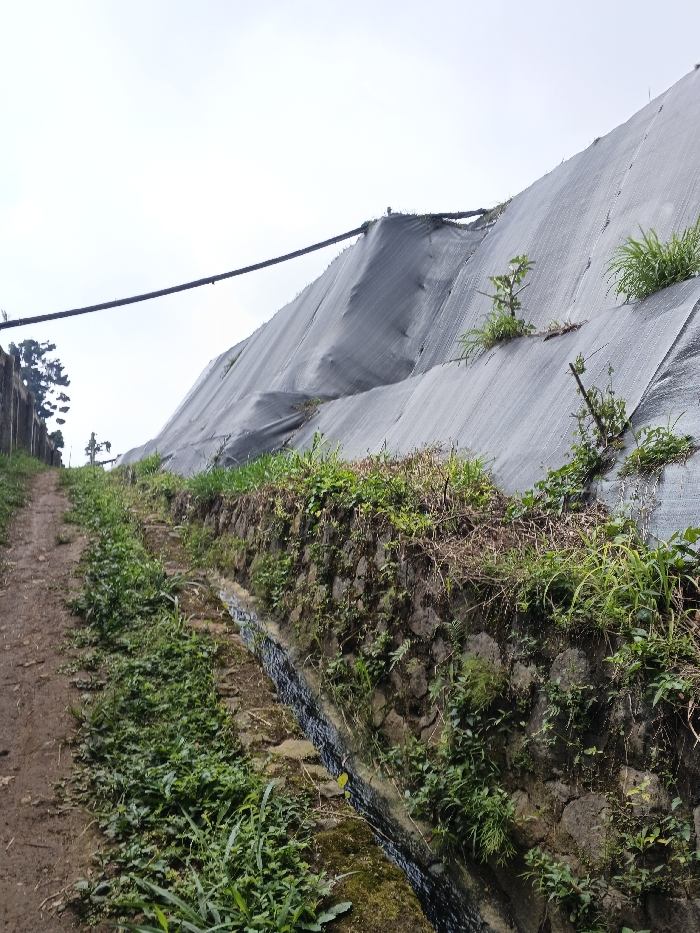 This image depicts an upward-sloping hillside in Uato Carabar, Timor-Leste, under an overcast sky. In the foreground on the left, a reddish-brown dirt path ascends, flanked by green vegetation. To the right of the path, a stone retaining wall, constructed from irregularly shaped stones and covered with moss and various plants, supports the higher terrain. A narrow, dark water channel runs at the base of this stone wall, parallel to the path. Further to the right and ascending steeply is a large embankment covered extensively with a dark grey or black geotextile fabric or netting, appearing taut but with some folds. Patches of green grass and small plants protrude through or grow on this fabric-covered slope. A thick, dark cable or power line spans horizontally across the upper-middle portion of the frame, above the covered embankment. A few distant trees are visible on the far left horizon. No individuals are present in the scene.