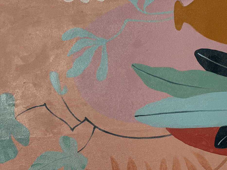 The image displays a detailed section of a stylized mural on a wall, located in Thành phố Phan Thiết, Vietnam. The artwork features an abstract botanical composition against a textured, light reddish-brown background. A large, soft pink semi-circular shape occupies the central-right area. Various flat-rendered leaf forms are depicted, primarily in shades of light teal, mint green, and dark greenish-blue, some with thin, dark linear stems extending across the background. In the lower right, a rust-orange colored vase is partially visible, containing several light teal plant elements. Additional reddish-orange leaf shapes are present on the left side. The scene is static, depicting an artistic representation with no individuals or active elements.
