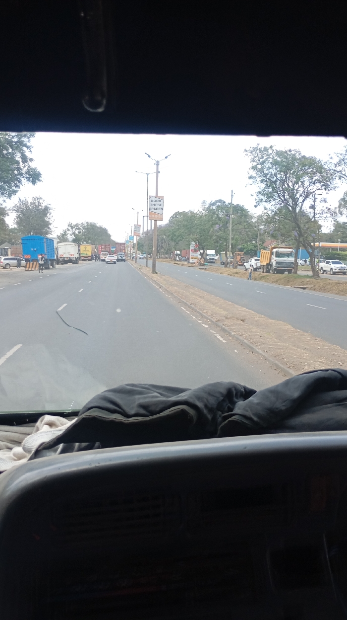 A view from inside a vehicle, looking out onto a long, straight road with light traffic. The road is lined with trees and light poles, with commercial buildings and parked vehicles on both sides. A sign reading "BOOK THESE SPACES" is visible. The dashboard of the vehicle is in the foreground with clothes piled on top.