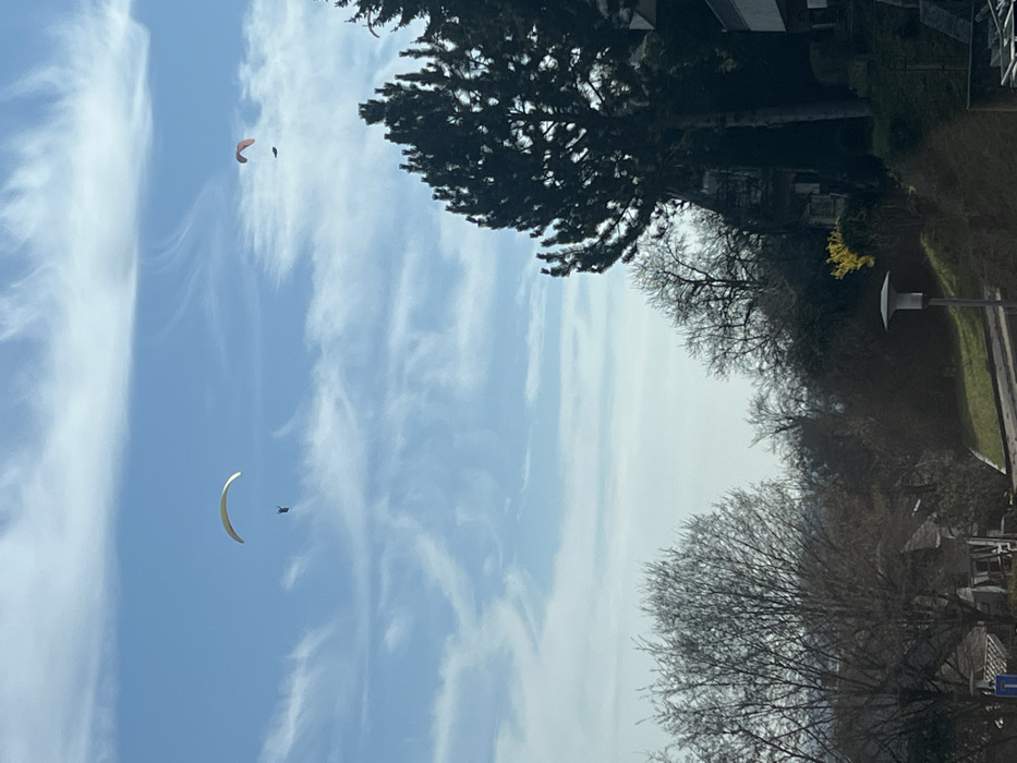 The image displays a daytime outdoor scene above a residential or semi-urban area in the city of Unknown, Unknown. The sky is light blue with scattered, wispy white cirrus clouds. Two paragliders are visible in the upper portion of the frame. One paraglider, positioned toward the upper-left, features a light yellow canopy with a dark figure suspended beneath. A second, smaller paraglider is located further to the right, exhibiting a reddish-orange canopy with a dark figure suspended below. The lower two-thirds of the image depict a sloped, vegetated landscape. On the left, a large deciduous tree stands with bare branches. To the right, a tall, dark green coniferous tree dominates the midground. Other bare trees and dense green foliage cover the hillside, which appears to be rising towards the right. A small cluster of yellow-flowering shrubs is visible in the lower-right midground beneath the coniferous tree. A paved road or path curves into the scene from the lower-left, ascending towards the right. A light gray, pole-mounted street lamp with a flat top is situated on a grassy incline beside the road in the lower-right foreground. Portions of multi-story buildings are visible on the far right, partially obscured by trees, suggesting structures built into the hillside. A blue rectangular sign is partially visible on the far left, adjacent to the road.